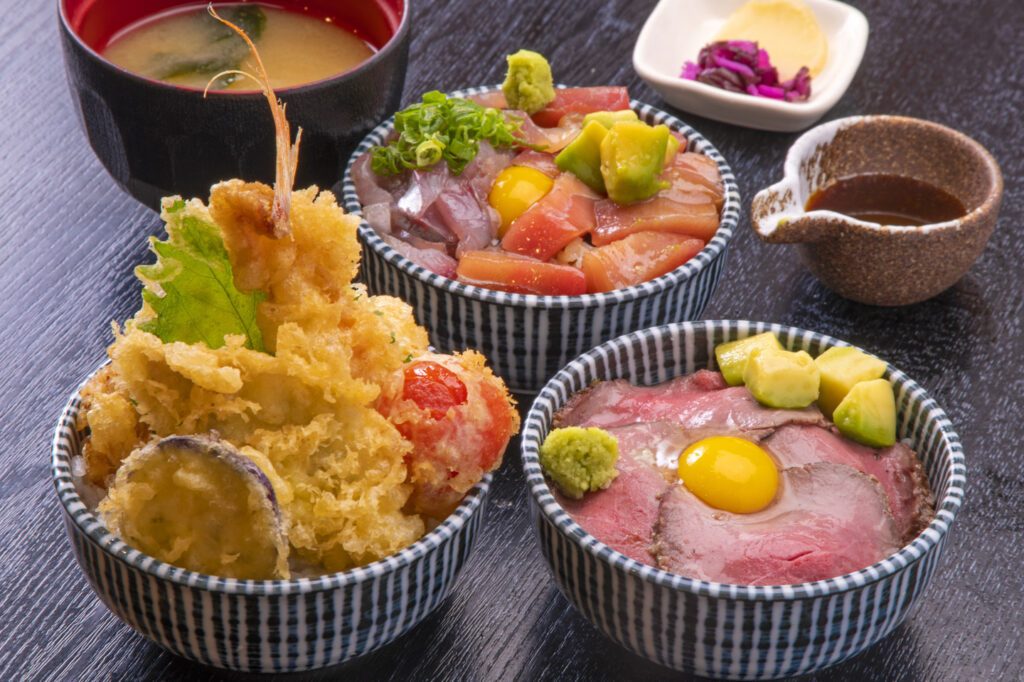 ランチタイムには、贅沢な「金目鯛のひつまぶし」や、出汁茶漬けで二度三度と美味しい伊豆名物「鯵のまご茶膳」、そして丼ぶりの上に伊豆の海を表現した「和The 海の玉手箱」など、新鮮な海の幸をふんだんに使ったお料理が揃います。