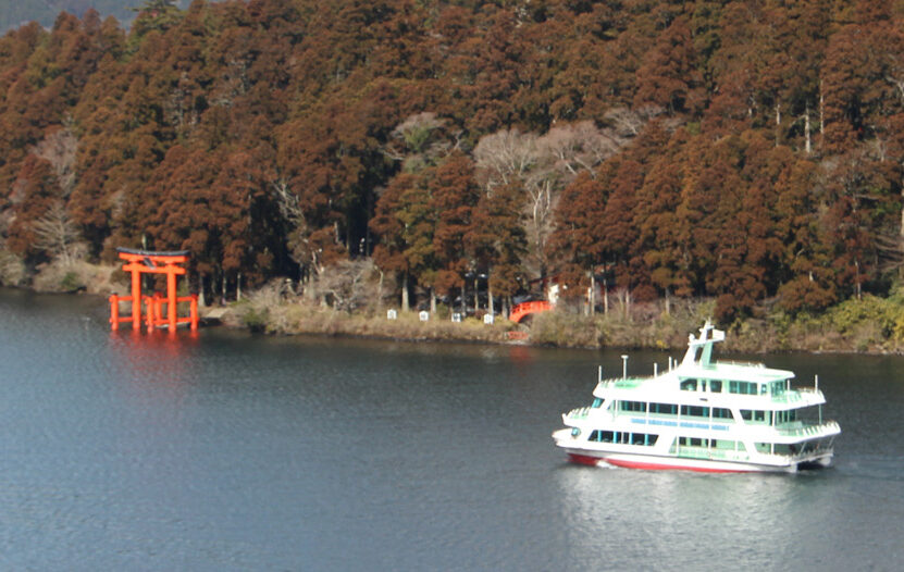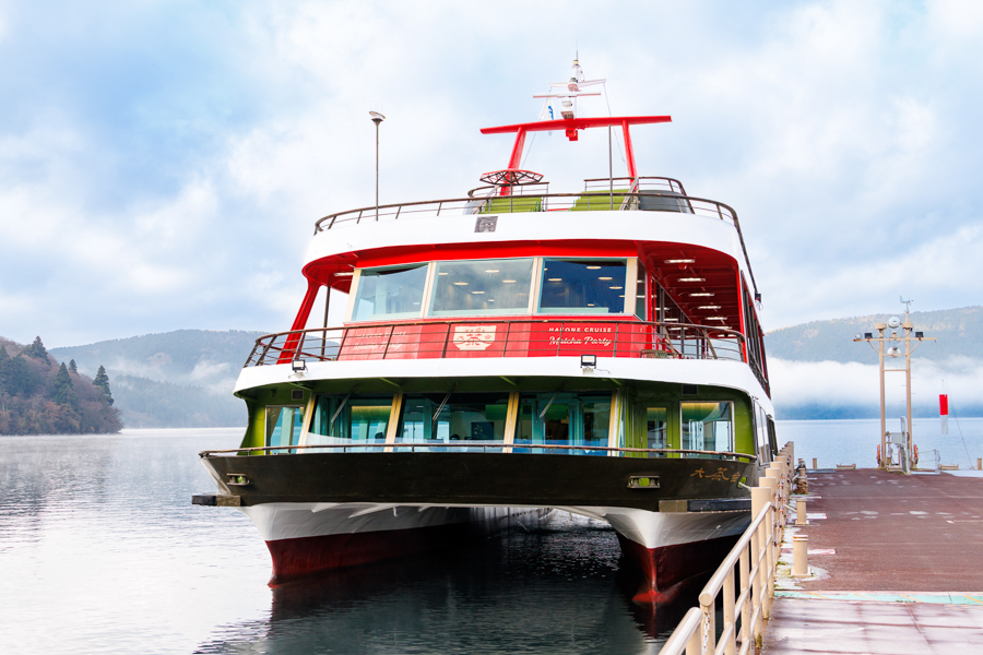 箱根関所跡港、元箱根港、箱根園港、湖尻港を結ぶ航路は、まさに絶景の連続です。 双胴船ならではの揺れの少ない安定した乗り心地で進む先には、遮るもののない富士山の姿。そしてハイライトは、箱根神社の「平和の鳥居」です。