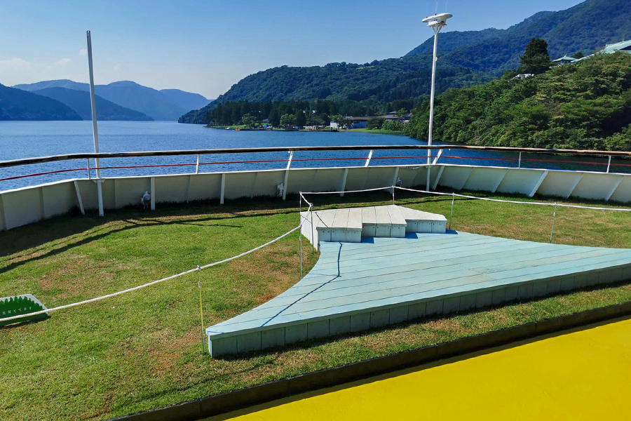 船に乗り込むとまず驚くのが、鮮やかな天然芝が敷き詰められた屋外デッキです。 「KAZEデッキ」と呼ばれるこの場所には、焚き火台をイメージした円形ベンチや、富士山型のモニュメント、さらにはブランコ風のベンチまで配置されています。湖を渡る風を全身で感じながら、まるで公園でピクニックをしているかのような、のんびりとしたひとときをお過ごしいただけます。