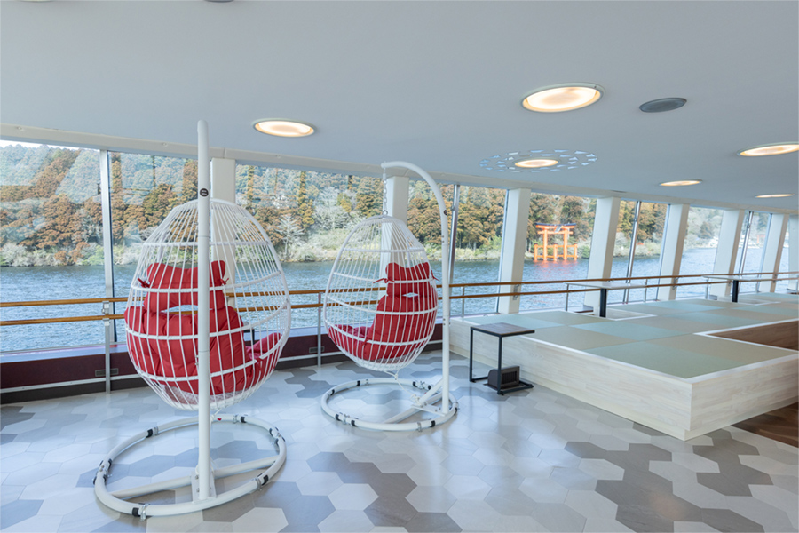 箱根の雄大な自然を、これまでになく自由で開放的なスタイルで楽しめるのが、新しい遊覧船「箱根遊船 SORAKAZE(そらかぜ)」です。 「芦ノ湖に浮かぶ緑の公園」というコンセプトの通り、従来の遊覧船の枠を超えた、癒やしと遊び心に満ちた空間が湖上に広がっています。